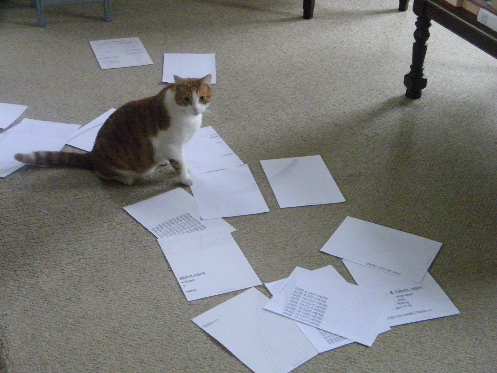 Ha ha ha, my cats did the same thing with all those printed shrug pieces on the floor, but one also hid under a piece of paper while chewing up another! Mary Beth's directions for the shrug are great but the cats make it take more time.
