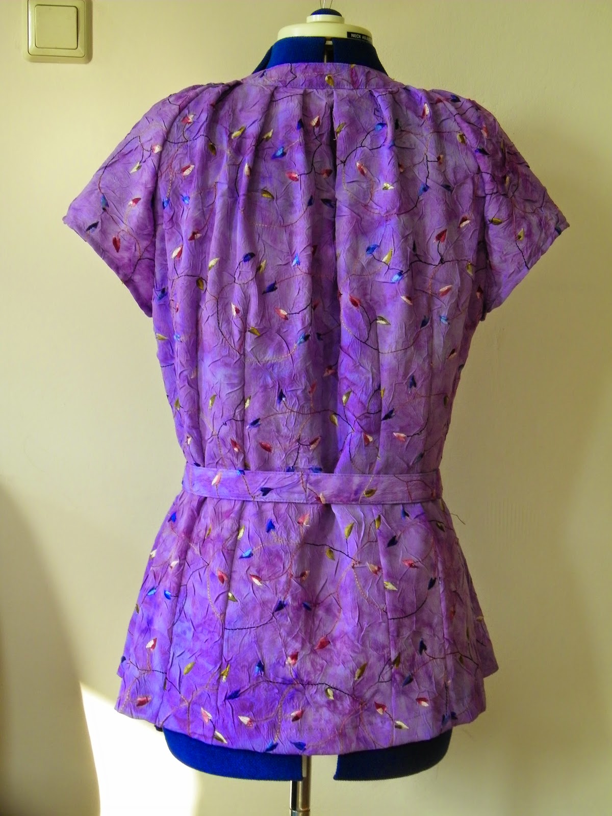 When I basted the hem, I saw that the back was higher than the front. Suppose having a swayback does that for you. I lengthened the centerback hem by 2,5 cm, tapering to nothing at 10 cm past the sideseams in the front. Now, when I wear it, the hem is even all around. Good decision.
