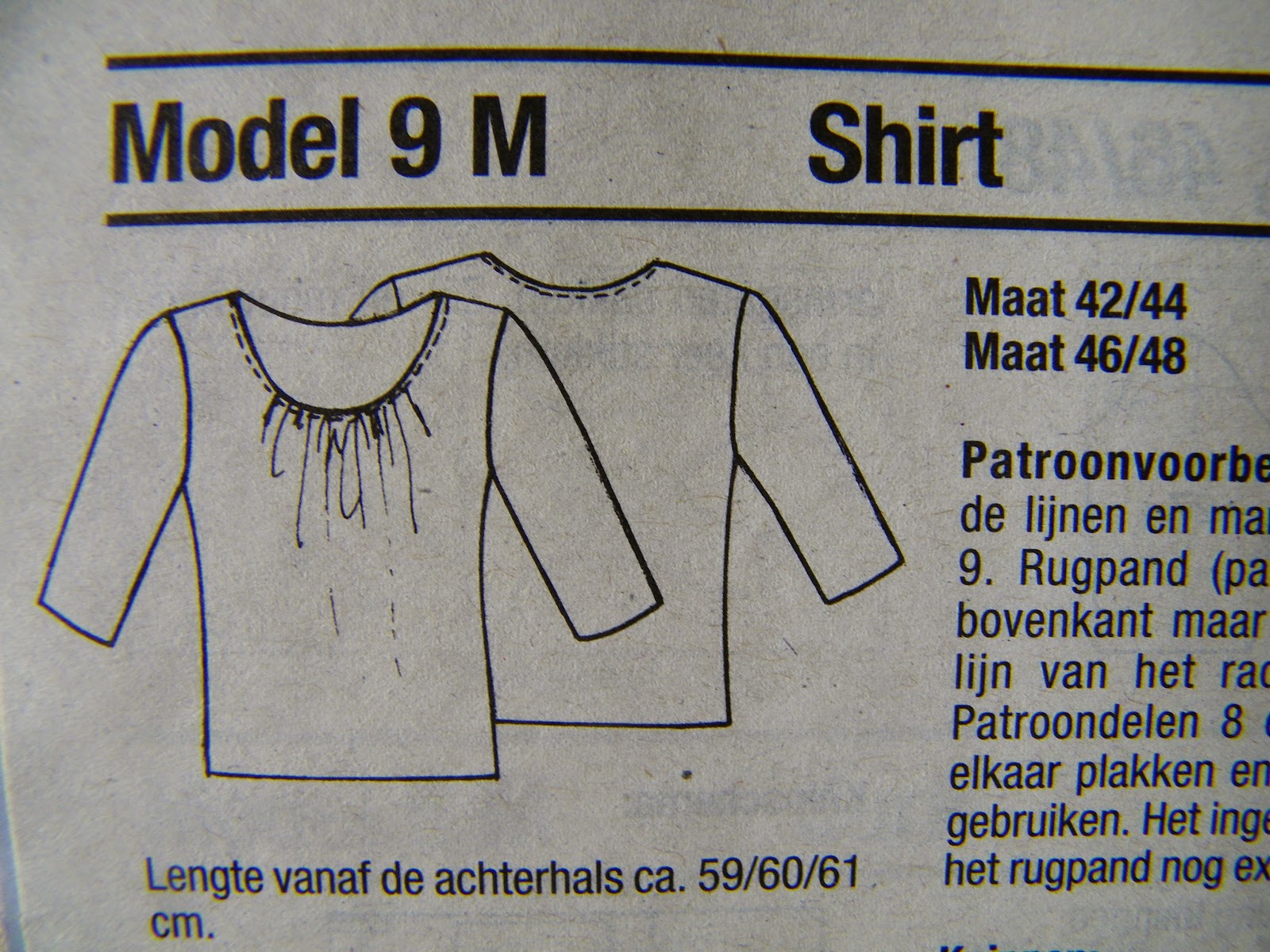 So what was I to do? Start looking for a new pattern (which would cost more time) or make do with what I had? I choose the last option and decided to eliminate the sleeves. I could still use this top to wear under jackets, cardigans etc. With full steam ahead I started to sew. Then I saw that the shoulderseams were not matching. The back was way smaller than the front. (This probably has to do with the fact that I had to draw a new size between the patternlines of size 42/44 and 46/48). I had to recut and reshape the front neckline in the shoulder area. That meant the facing had to be reshaped as well.